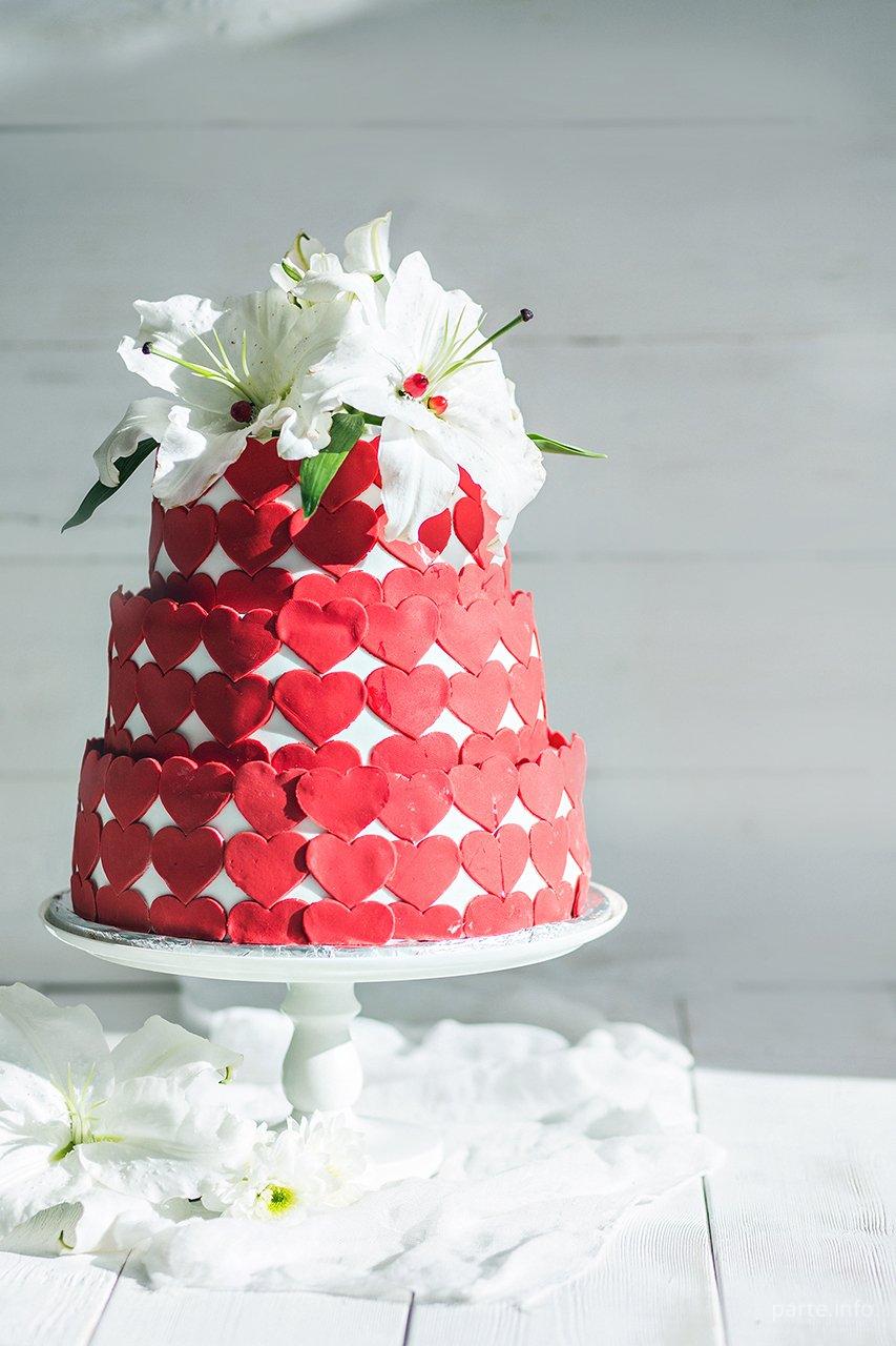 Свадебный торт ,в мастичном оформление в виде ярких сердец ,украшенный нежными ,живыми лилиями