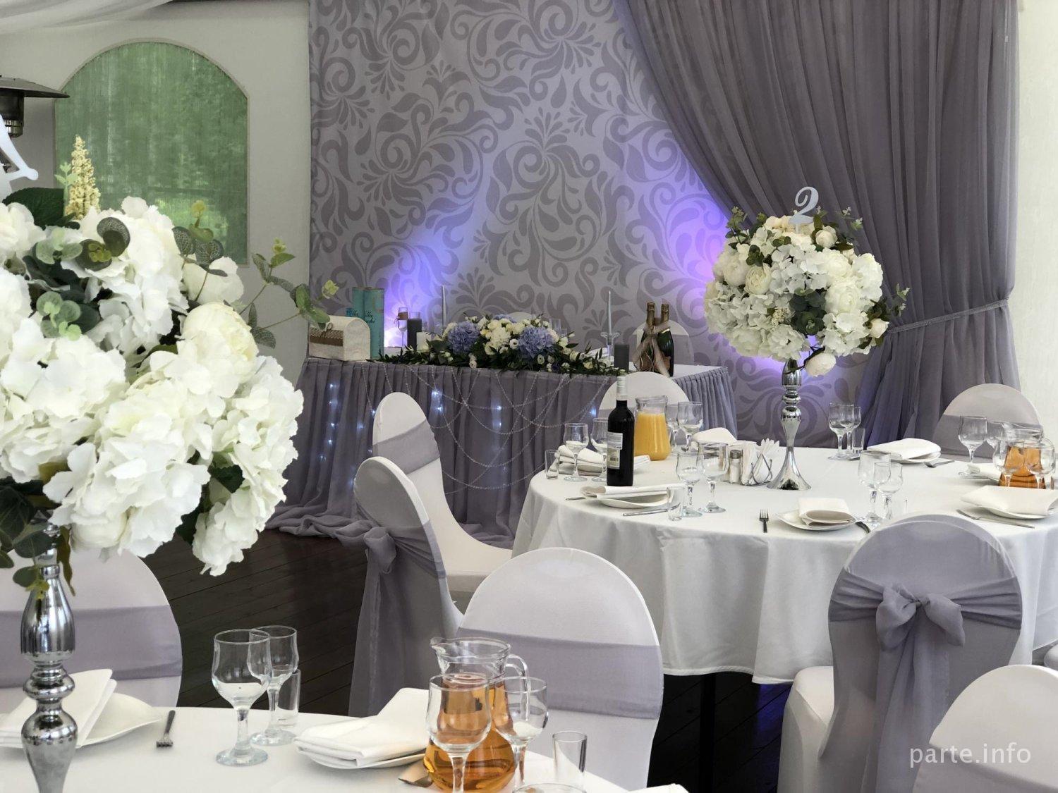 Прекрасный серый цвет подойдет под любой декор бакетного зала и добавит изюминку своим необычным орнаментом за молодыми